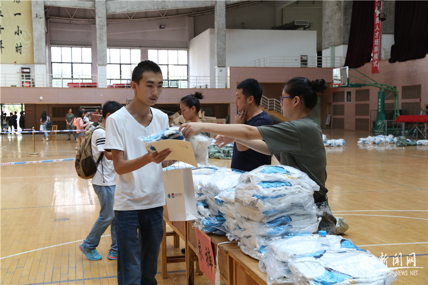 在迎新大道上,校領導一行先后來到各學院(部)迎新點一一慰問。每到一處,姚校長都會關切地詢問:“報了多少人了?”、“手續(xù)辦理快不快,需不需要排隊?”,并了解暑假期間有關學院開展的專業(yè)認證、評估等工作情況,同時不忘殷殷叮囑工作人員和學生志愿者:“天比較熱,大家要注意身體?!痹谖捏w館的服裝發(fā)放點,姚校長戴上要發(fā)給新生的印有?;盏拿弊?,感受了一下舒適度;又摸摸新生即將在軍訓中穿的迷彩短袖,點點頭:“在這個天氣,穿這個比較涼快。”