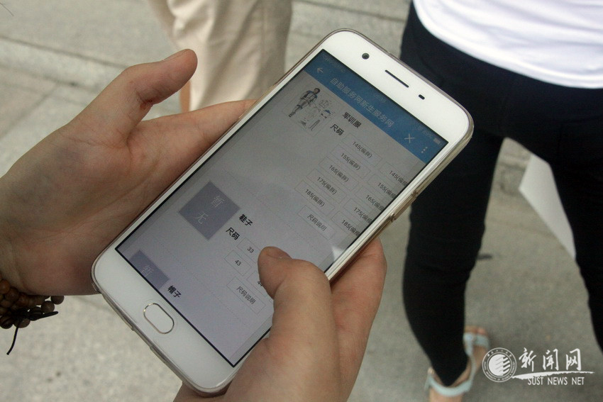位于文體館發(fā)放軍訓服點,來自設計與藝術學院的新生毛蕊給記者演示了她如何在易班上預訂服裝的過程:登陸易班、選擇自助報到頁面、進入服裝預訂系統(tǒng),即可提前網(wǎng)上選擇?!罢嬲媸欠奖阌挚旖莅?!”毛蕊說。