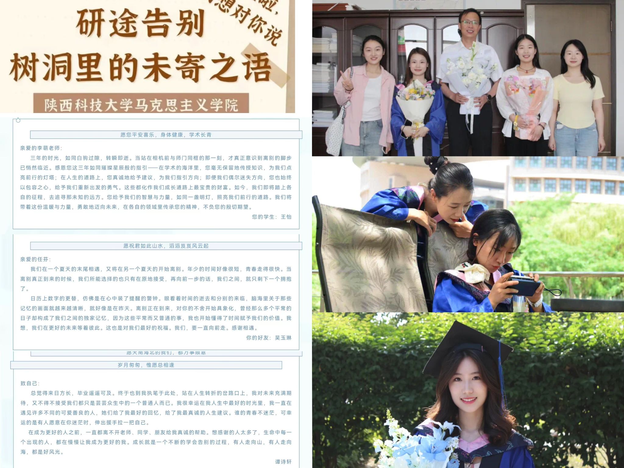 畢業(yè)的序章里總有一些未說(shuō)盡的情愫藏在抽屜深處,學(xué)院開(kāi)展“告別研途”樹(shù)洞征集活動(dòng),為2025屆畢業(yè)生搭建情感表達(dá)平臺(tái)。畢業(yè)生們通過(guò)匿名或署名方式,向?qū)?、同窗或未?lái)的自己投遞"心靈信箋",將那些藏在心底的感恩、期許與祝?;魑淖?。一封封真摯的書(shū)信,承載著畢業(yè)生們最深沉的情感。