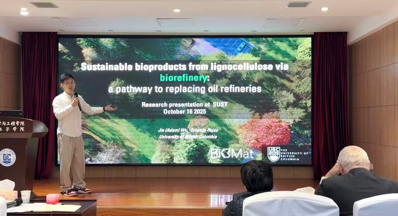 UBC畢然研究員介紹了具有定制功能的纖維素基薄膜創(chuàng)新制備策略,包括物理結(jié)構(gòu)構(gòu)建、化學(xué)改性和廢棄物再利用。展示了木質(zhì)纖維素在設(shè)計(jì)高性能、多功能材料方面的靈活性。UBC吳杰博士后介紹了通過(guò)生物煉制技術(shù)從木質(zhì)纖維素中獲取可持續(xù)生物產(chǎn)品的方法,并對(duì)生物精煉技術(shù)未來(lái)在提升轉(zhuǎn)化效率、降低成本及推動(dòng)產(chǎn)業(yè)化應(yīng)用的發(fā)展展開(kāi)了探討。中國(guó)科學(xué)院過(guò)程研究所盧翊研究員圍繞可再生資源高效轉(zhuǎn)化與綠色制造的前沿方向,闡述了如何利用生物質(zhì)組分膠體間非共價(jià)相互作用構(gòu)筑和利用非平衡態(tài)液液界面等。為開(kāi)發(fā)兼具高效轉(zhuǎn)化率與高附加值的綠色新材料體系提供新理論方向與技術(shù)路徑。東北林業(yè)大學(xué)宦思琪教授通過(guò)利用界面工程策略,從富含羥基和復(fù)雜網(wǎng)絡(luò)結(jié)構(gòu)的纖維素和木質(zhì)素(生物聚合物)中通過(guò)液/液界面實(shí)現(xiàn)自組裝,形成乳液膠體,設(shè)計(jì)并制備出了多維功能材料??朔艘痪S材料中協(xié)同結(jié)構(gòu)-功能設(shè)計(jì)的長(zhǎng)期難題。