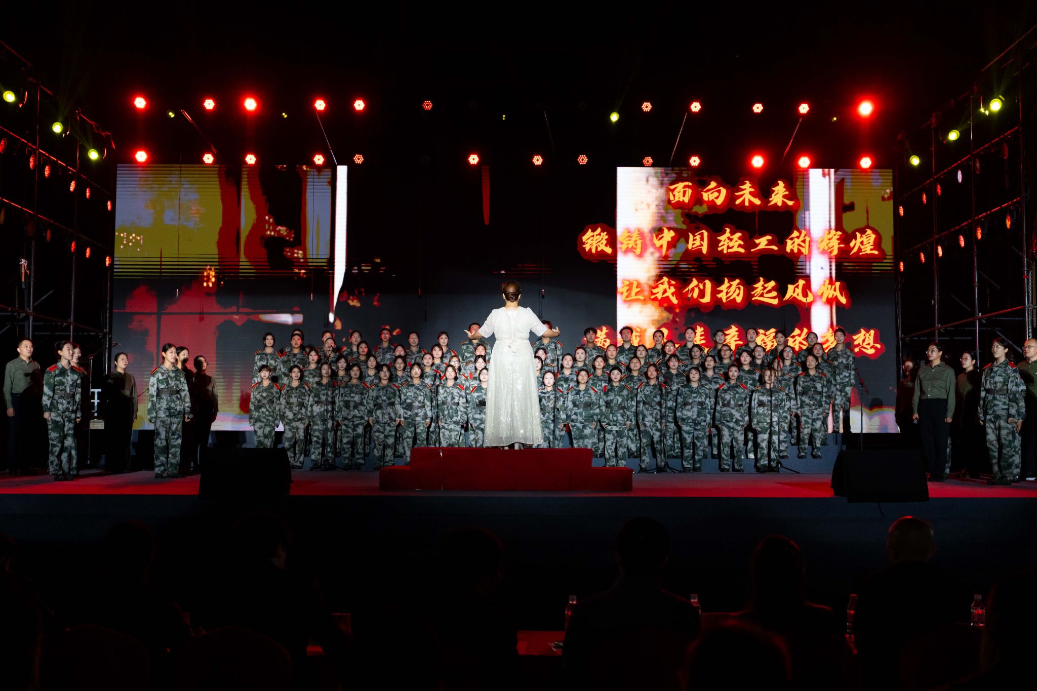 本次活動(dòng)特邀校歌《遠(yuǎn)航》曲作者、西安音樂(lè)學(xué)院作曲系二級(jí)教授陳大明等多位專家及校內(nèi)職能部門代表?yè)?dān)任評(píng)委。由全校15個(gè)學(xué)院師生組成的合唱隊(duì)依次登臺(tái),以校歌《遠(yuǎn)航》為必選曲目,輔以各具特色的自選歌曲,融合朗誦、舞蹈、器樂(lè)、情景表演等多種形式,展現(xiàn)各學(xué)院賡續(xù)輕工薪火、凝聚師生力量的價(jià)值追求,用嘹亮歌聲凝聚起砥礪輕工報(bào)國(guó)、矢志“雙一流”建設(shè)的磅礴力量。