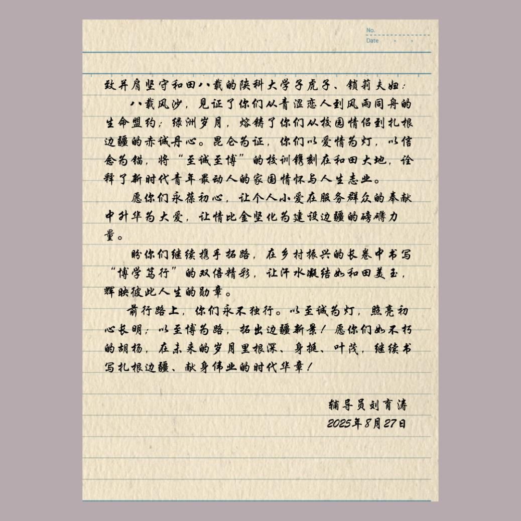 “渭水同窗,昆侖共守”,李虎與馮鎖莉的故事,未有驚天動(dòng)地的壯闊波瀾,卻蘊(yùn)藏著直抵人心的精神力量。這份力量,是伴侶間的相契與篤行——從陜西科技大學(xué)校園里的并肩求索,到和田邊疆的風(fēng)雨同舟,他們以愛為舟楫,將小家的溫情揉進(jìn)邊疆的日月,讓“相守”不再是單薄的承諾,而是浸潤在柴米油鹽與守望相助里的具象人生;是共產(chǎn)黨人的初心與擔(dān)當(dāng)——以信念為錨點(diǎn),扎根于塔克拉瑪干沙海之畔,在走村入戶的奔波、服務(wù)鄉(xiāng)親的瑣碎里,踐行著“到祖國最需要處去”的誓言,讓“奉獻(xiàn)”脫離空泛的口號(hào),成為浸潤在每一次解民憂、紓民困中的實(shí)在行動(dòng);更是陜科大學(xué)子的赤誠與風(fēng)骨——攜著對土地的敬畏、對責(zé)任的恪守,將青春的印記深深鐫刻在昆侖山腳下的熱土之上,讓“成長”不再是個(gè)人的踽踽獨(dú)行,而是與邊疆發(fā)展同頻共振的雙向奔赴。