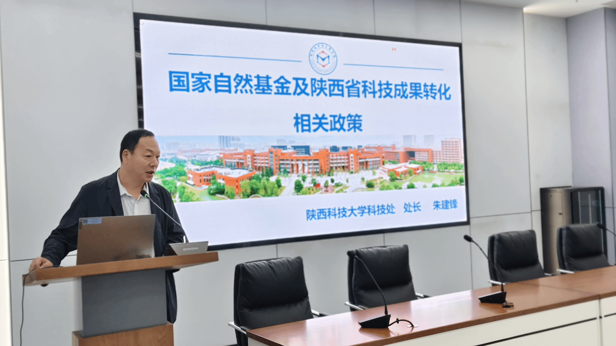 會上,朱建鋒作“國家自然基金及陜西省科技成果轉(zhuǎn)化相關(guān)政策”專題報告,系統(tǒng)解讀了國家自然科學(xué)基金的最新政策動向與陜西省科技成果轉(zhuǎn)化的激勵措施,重點介紹科技處提供的、覆蓋“申報-獲批”全鏈條的支持保障體系,并深入闡述“一院多市、多院一市”校地合作方針的戰(zhàn)略內(nèi)涵,積極構(gòu)建靈活高效的協(xié)同創(chuàng)新機(jī)制,服務(wù)區(qū)域發(fā)展。