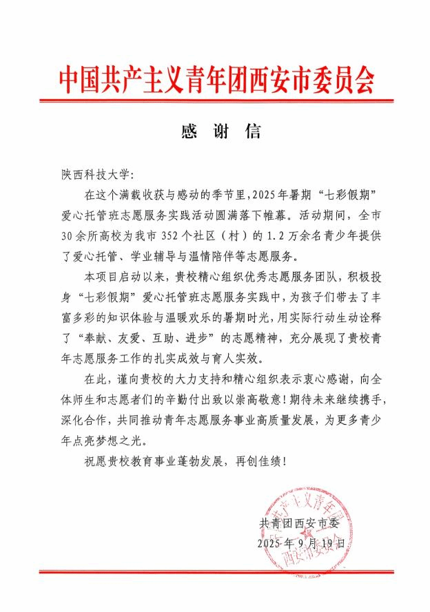 近日,我校收到共青團(tuán)西安市委就感謝我校在2025年暑期“七彩假期”愛心托管班志愿服務(wù)實(shí)踐中的大力支持和精心組織的感謝信。這份肯定既是對科大志愿者們在“七彩假期”活動中躬身踐行、熱忱奉獻(xiàn)的高度認(rèn)可,更是對我校青年志愿服務(wù)工作深耕細(xì)作的充分肯定。