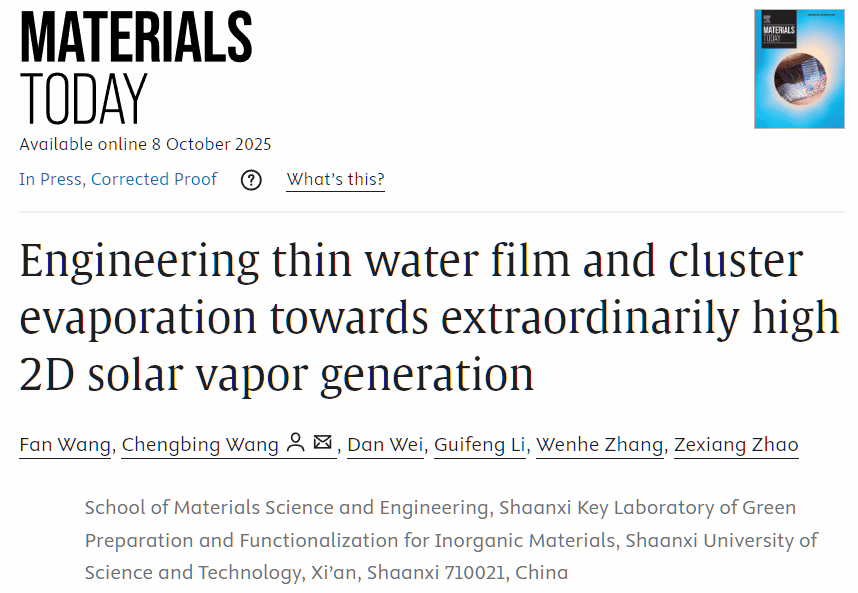 (1) Fan Wang, Chengbing Wang,* Dan Wei, Guifeng Li, Wenhe Zhang, Zexiang Zhao Engineering thin water film and cluster evaporation towards extraordinarily high 2D solar vapor generation, Materials Today 2025, DOI: 10.1016/j.mattod.2025.09.023.