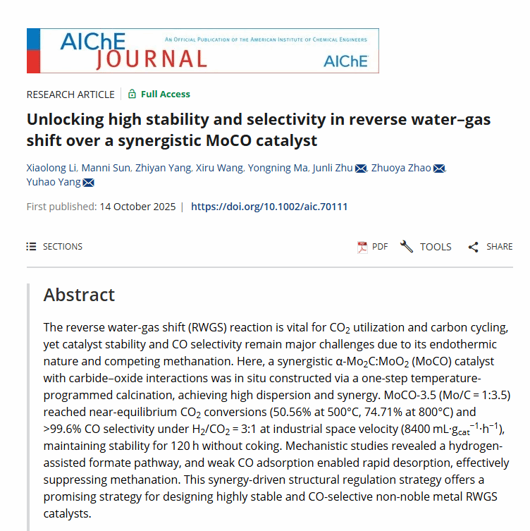 團(tuán)隊(duì)通過(guò)一步控溫焙燒法原位構(gòu)建碳化物–氧化物協(xié)同體系(α-Mo?C:MoO?),形成高分散MoCO復(fù)合界面。MoCO-3.5在CO?/H? = 1:3條件下,于800 °C實(shí)現(xiàn)74.71% CO?轉(zhuǎn)化率和超過(guò)99.6%的CO選擇性,在工業(yè)級(jí)反應(yīng)空速下具有優(yōu)異穩(wěn)定性且無(wú)積碳生成。機(jī)理研究表明該催化劑遵循氫輔助的甲酸鹽反應(yīng)機(jī)理。CO的快速脫附有效抑制了CO在催化劑表面被深度加氫生成甲烷。該成果為開(kāi)發(fā)高穩(wěn)定、高選擇性、非貴金屬催化劑提供了新思路。研究以“Unlocking high stability and selectivity in reverse water-gas shift over a synergistic MoCO catalyst”為題發(fā)表在《AIChE Journal》。實(shí)驗(yàn)工作主要由2023級(jí)碩士研究生孫曼妮完成。https://doi.org/10.1002/aic.70111